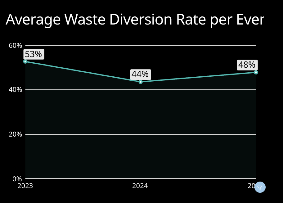 The diversion rate helps us look more deeply into the waste management practices of the event and venue. Here, we can see that even though the overall waste number is up this year, their diversion rate is holding steady, indicating that their practices are consistent year over year, and they’re likely coordinating well with their host venue and key partners.
